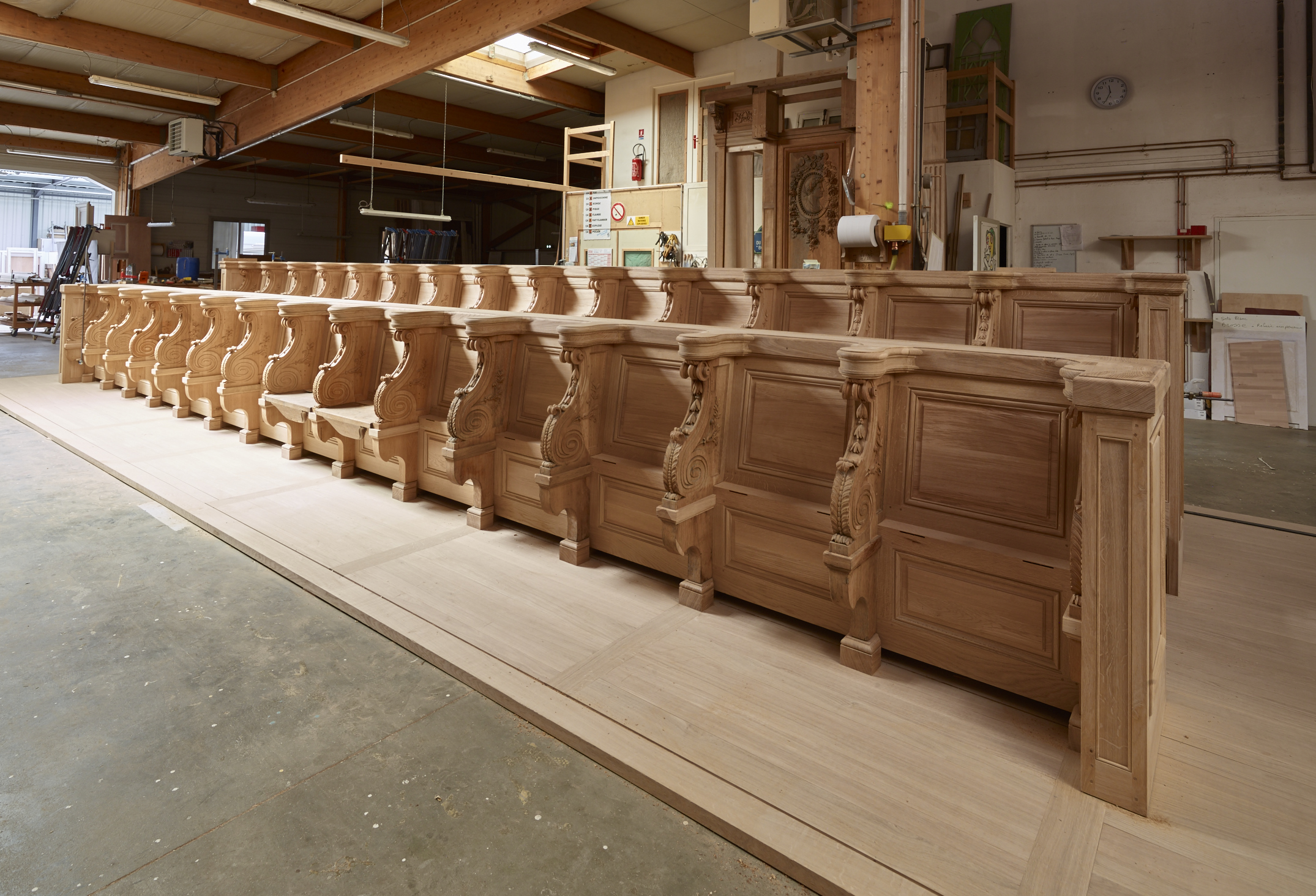 Après 1 an de travail en atelier et un montage à blanc spectaculaire, les stalles sont actuellement en cours de repose et pourront être visibles prochainement par le public.