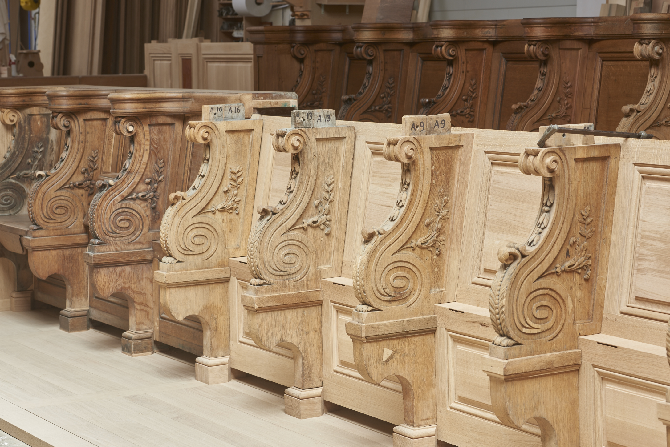 • Restituer les nombreux éléments manquants : 34 sièges, 11 miséricordes, 16 parcloses, 5 jouées, 1 médaillon à chiffre, 16 pilastres cannelés etc.