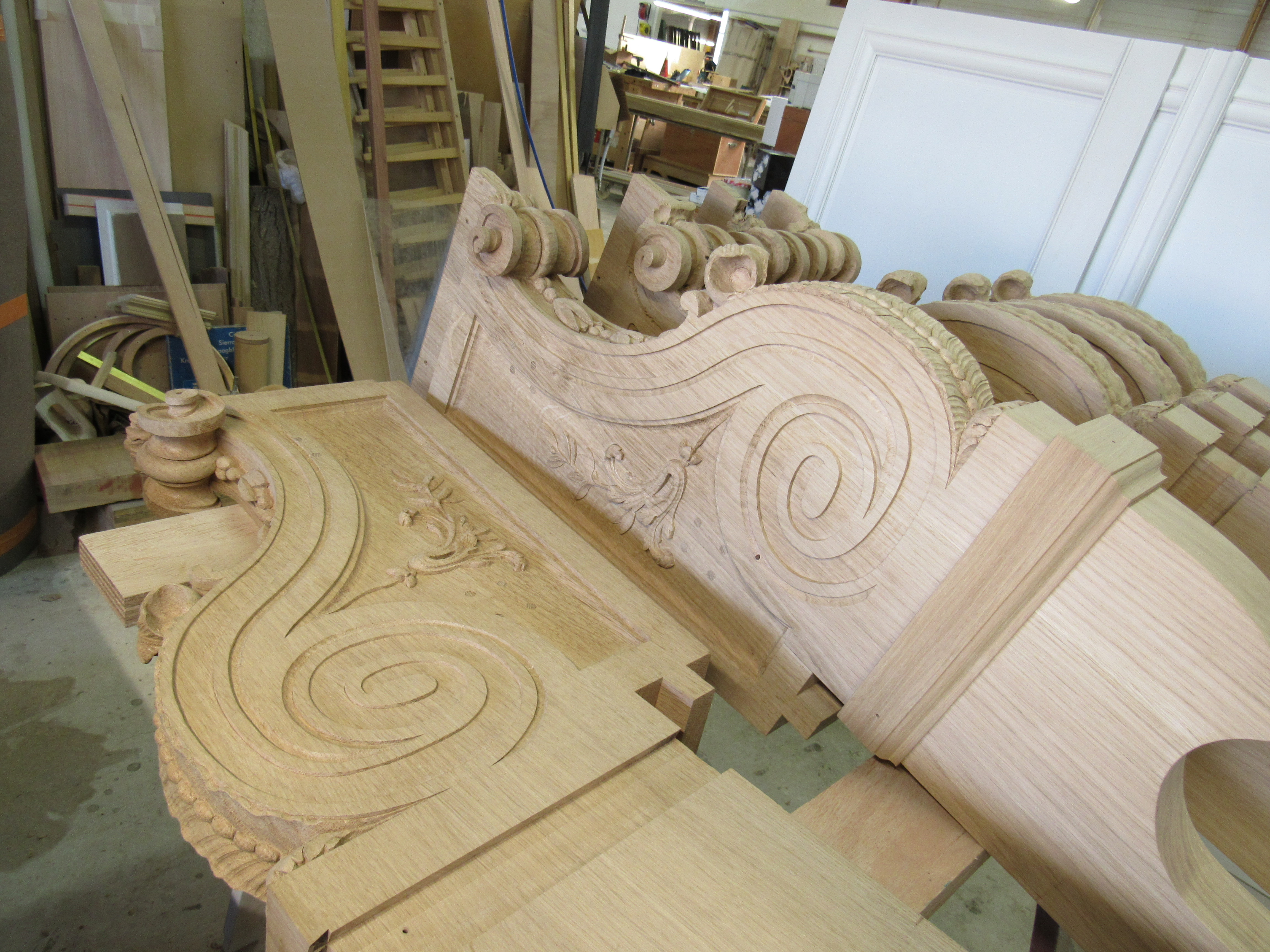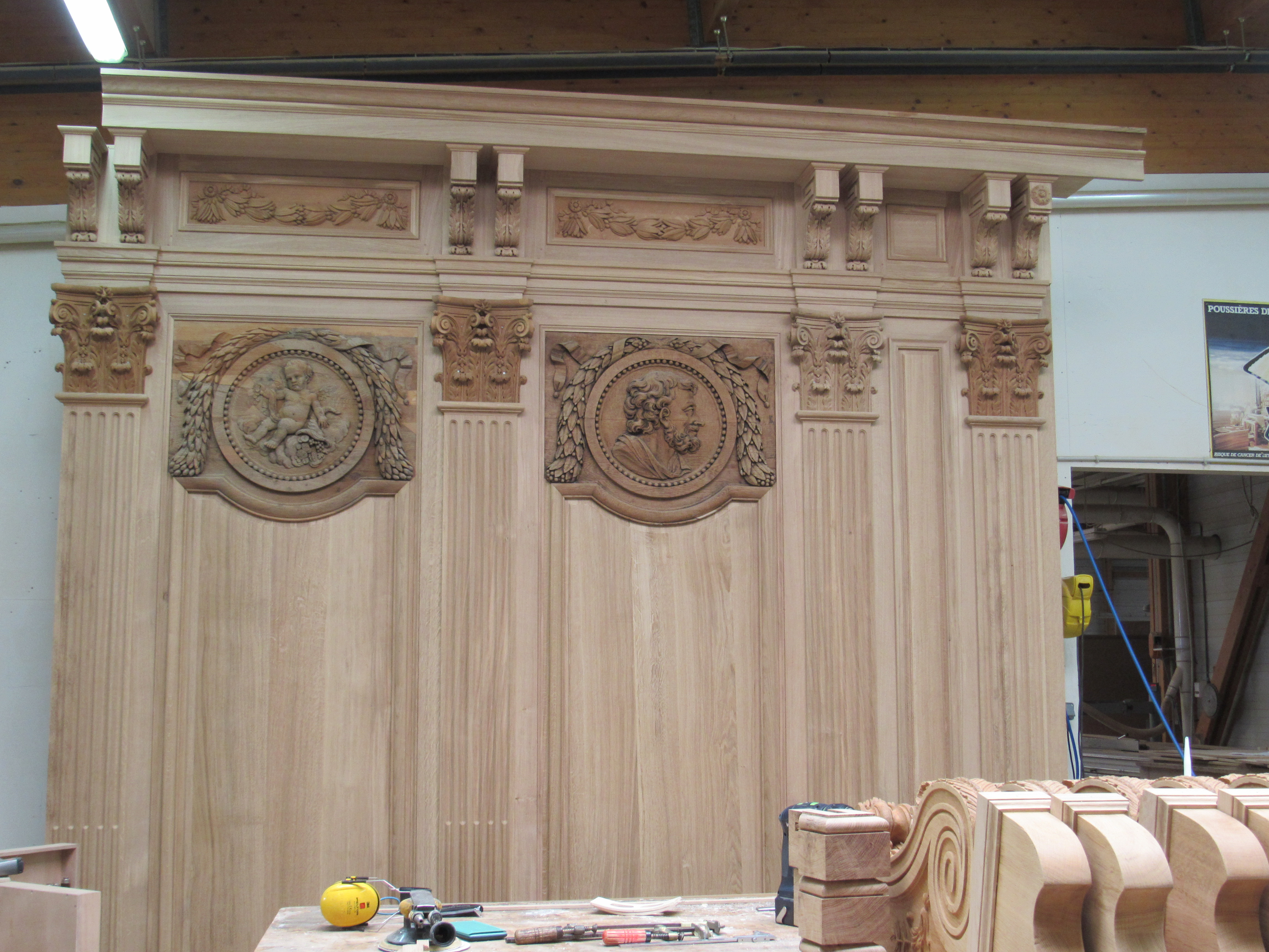 1. Reprendre les éléments restaurés et/ou restitués lors de la campagne de 1980 et stockés en caisse: ces éléments restaient inachevés notamment au niveau des assemblages. On notait également des gerces sur certains panneaux ainsi que quelques accidents dus au stockage.